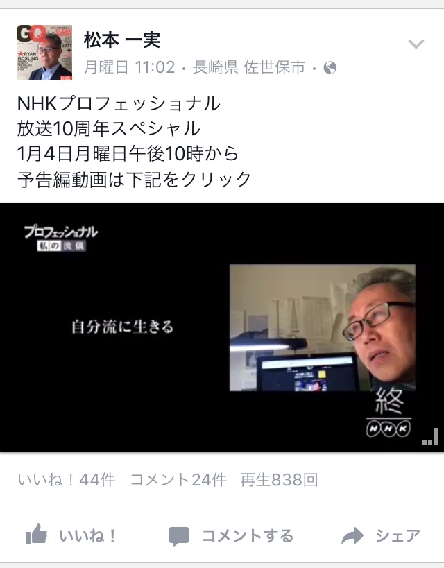 私が1月4日に投稿しましたNHKプロフェッショナルの動画ですが、Facebookでの再生数が838回を超えました。