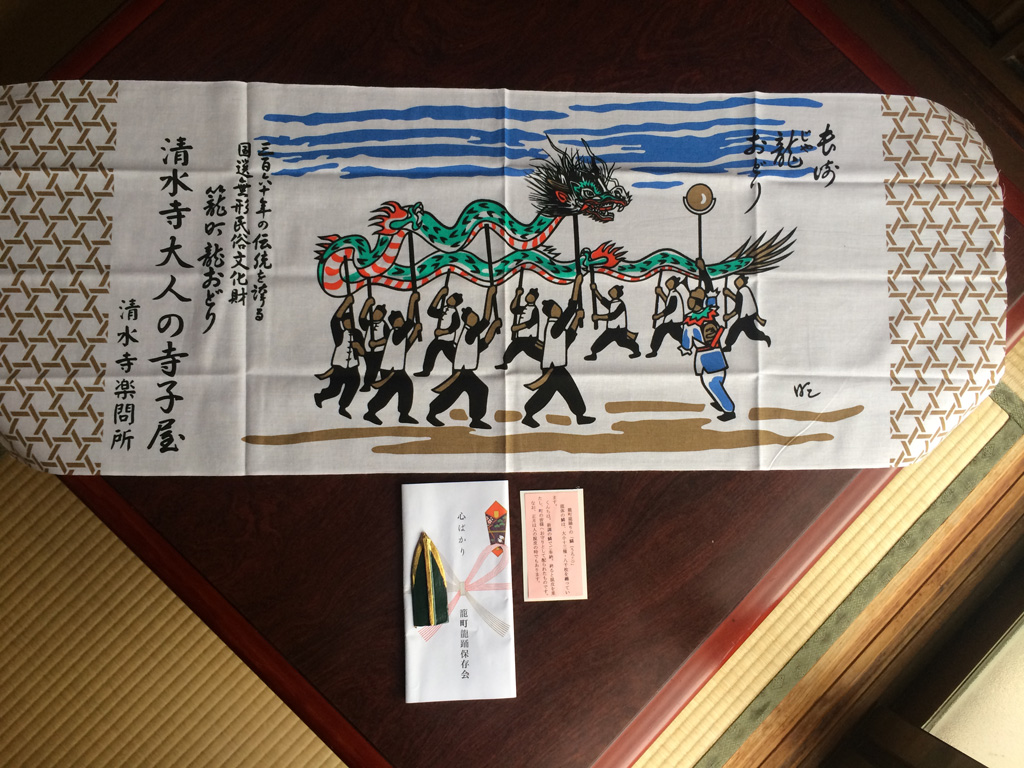 投稿日: 2013年11月11日 投稿者: admin長崎籠町龍踊りの鱗 昨日の長崎清水寺楽問所 長崎籠町龍踊保存会の伊藤さんから別誂えの手拭と龍の鱗をいただきました 籠町龍踊りの鱗(うろこ)は、龍体に大小13種、8,000枚がついているそうです 新調の鱗でご奉納して、終わると脱皮を果たし、町内の皆さんへお守りとして配られます 材料となる竹は、お諏訪さんの門松の竹を使うそうです。 鱗の裏は朱色に塗られて、本加護満知(ほんかごまち)と印されています。